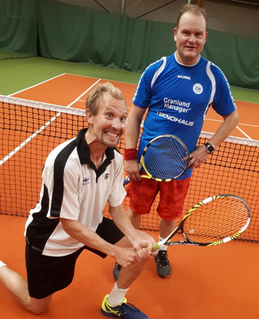 Vain pitkin hampain suostui Juho Vuorinen kyykytettäväksi edes valokuvaan tappiollisen ottelun jälkeen miesten 40 v. sarjassa. Pronssihymy irtosi kuitenkin pyydettäessä. Taustalla hopeaa voittanut Sami Lithenius, joka hallitsi myös miesten B-luokkaa. Siellä finaalissa kaatui niukasti pingiksen erikoismies Otto Tennilä.