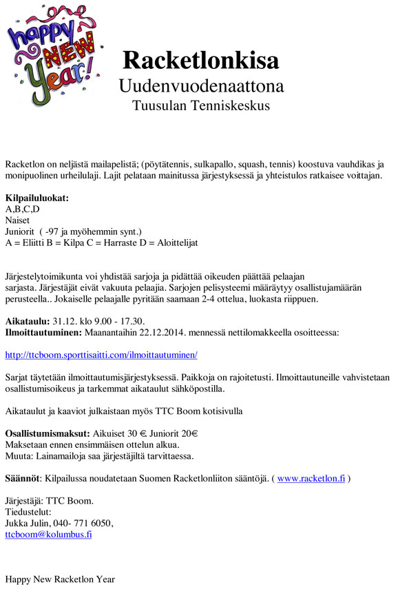 TTC Boom järjestää Racketlonkisan Uudenvuodenaattona Tuusulan Tenniskeskuksessa. Ilmoittautumiset maanantaihin 22.12. osoitteella ttcboom.sporttisaitti.com/ilmoittautuminen