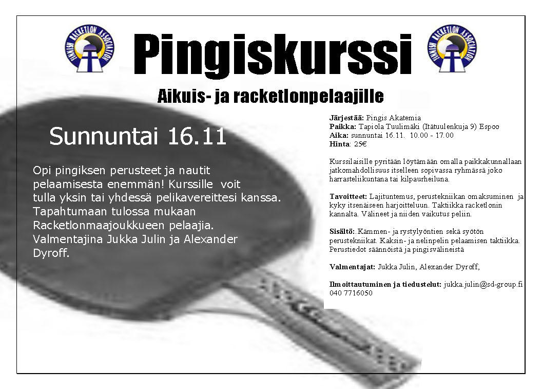 Racketlonliitto ja TTC Boom järjestävät Racketlonpelaajille suunnatun pingiskurssin Tapiolassa sunnuntaina 16.11.2008. Kurssin valmentajina toimivat Jukka Julin ja Alexander Dyroff.