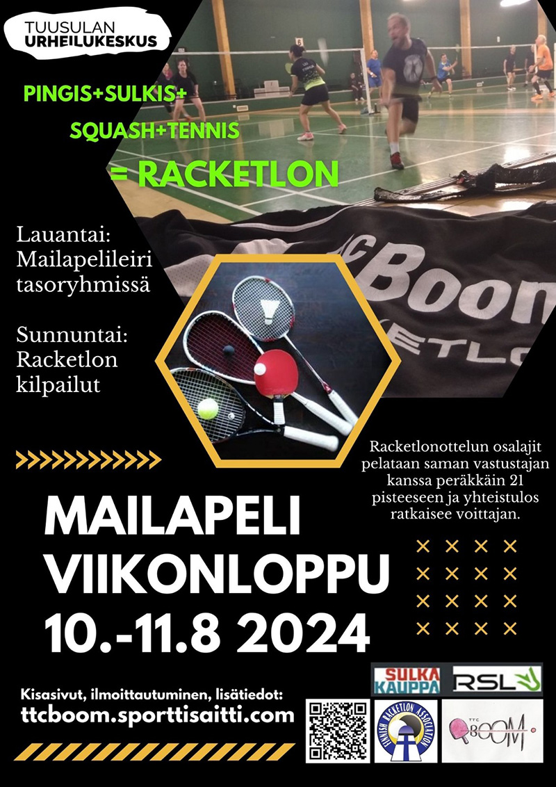 TTC Boom ja Suomen Racketlonliitto järjestävät yhdessä Mailapeliviikonlopun 10.-11.8.Tuusulan Urhelikeskuksessa (Urkka).