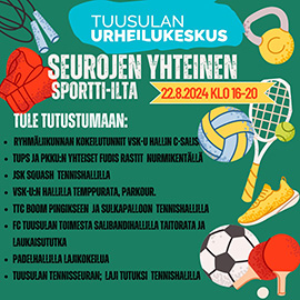 Tuusulan Urheilukeskuksessa järjestetään seurojen yhteinen sportti-ilta avoimien ovien merkeissä torstaina 22.8.2024 klo 16-20.00 välillä.