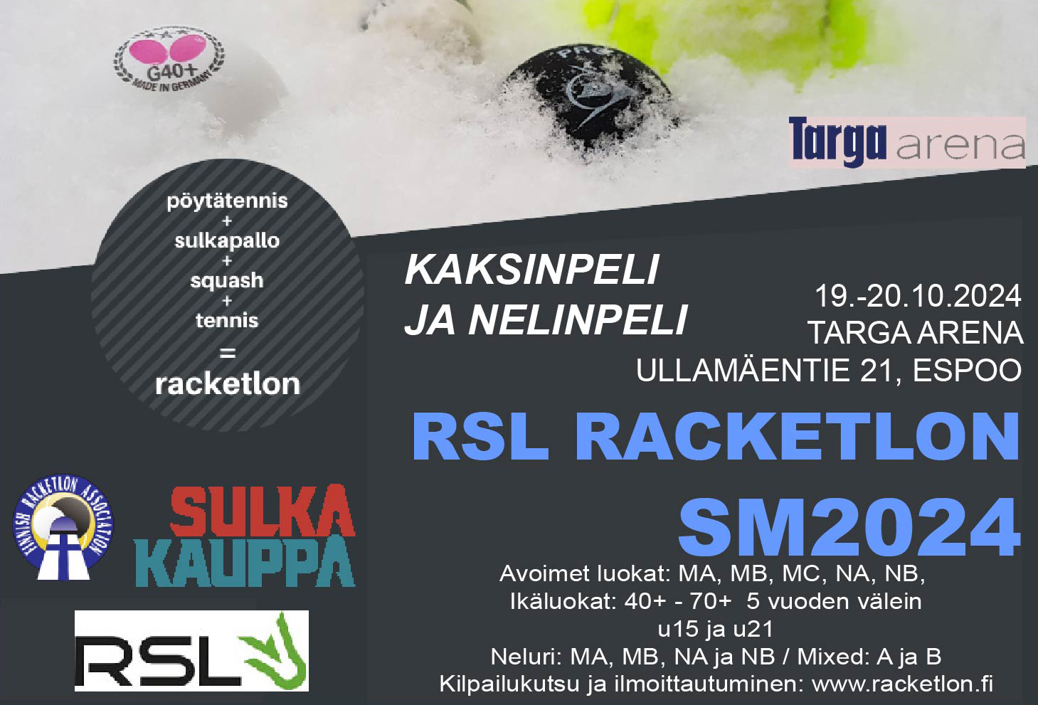 Racketlonin kaksinpelin ja nelinpelin SM-kisat pelattiin Targa arenassa lokakuun 19.-20. päivinä 2024. Miesten nestariksi kruunattiin Smashin Jesse Kiljunen, joka tasokkaassa ja jännittävässä loppuottelussa voitti RCU:n Joel Pennasen kahdella pisteennä.