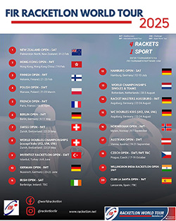 Kansainvälinen Racketlonliitto FIR on julkaissut oheisen vuoden 2025 Racketlon World Tour kalenterin, jonka saa hieman suuremmaksi klikkaamalla sitä.