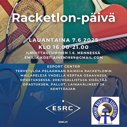 ESRC järjesti Esport Centerissä Mailapeli- eli Racketlonpäivän lauantaina 7.6., joka tarjosi kattavan ja kehittävän kokonaisuuden kaikille mukana olleille. Jokainen osallistuja otti askeleen lähemmäs monipuolista racketlonpelaajan profiilia. Päivä osoitti, kuinka arvokasta on treenata lajirajojen yli – samalla syveni ymmärrys omasta pelistä ja kokonaisvaltaisesta kehittymisestä.