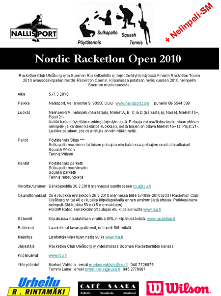 Racketlon Club Uleåborg järjestää Nordic Racketlon Open ja nelinpelin SM-kilpailut Oulussa 5.-7.3.2010. Kutsu on julkaistu.