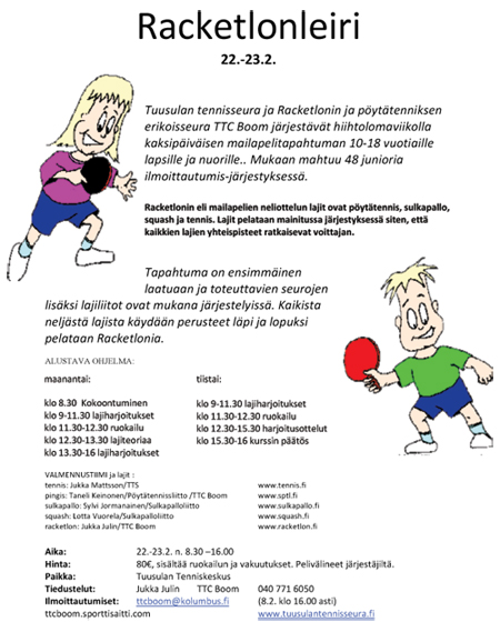 Keravalainen TTC Boom ja Tuusulan Tennisseura järjestivät hiihtoloman aluksi alueen junioreille racketlonleirin Tuusulan tennishallilla. Kaksipäiväisen leirin teemana oli mailapelien perustekniikat ja racketlon kilpailumuotona.