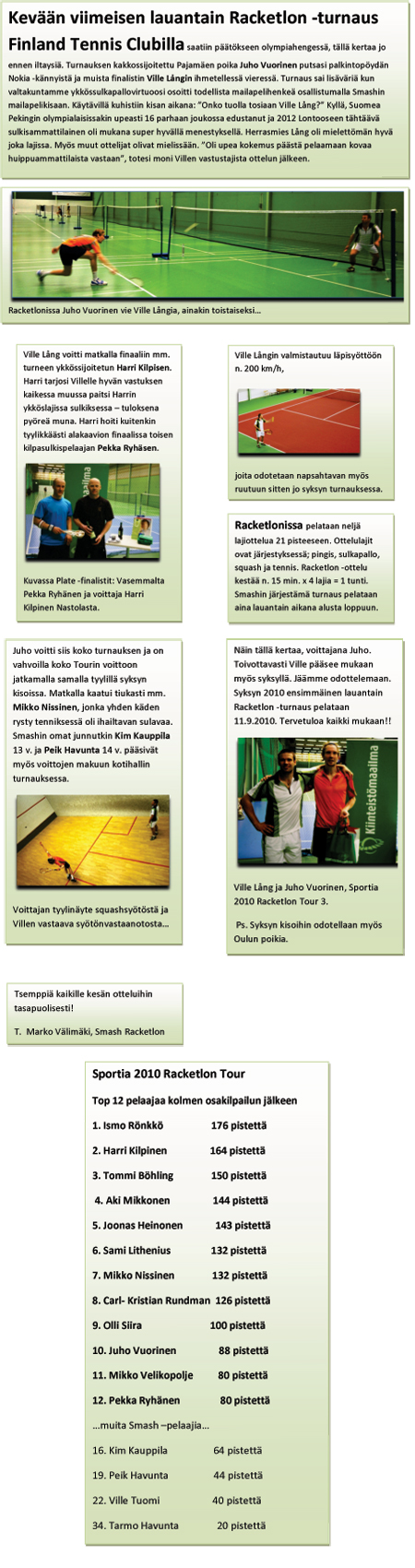 Smash Racketlon Posted in Kilpailukutsut 15.5.2010 Kevään viimeinen Sportia 2010 Racketlon Tournin osakilpailu pelattiin viime lauantaina. Share on Facebook ← Squashin SM-kisatRacketlon Open Tapanila / Puistola →