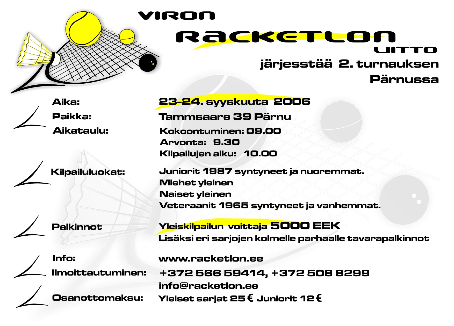 Kilpailu Virossa Posted in Uutiset 10.8.2006 Eestin Racketlonliitto järjestää syyskuun 23-24 päivinä kilpailun Pärnussa. Kutsu täällä. Share on Facebook ← Hutunki Openin sivut avattuHääonnitteluja → VastaaSinun täytyy kirjautua sisään kommentoidaksesi.