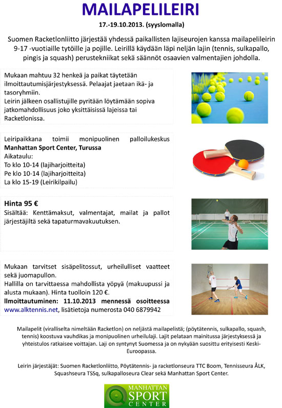Suomen Racketlonliitto järjestää yhdessä paikallisten lajiseurojen kanssa mailapelileirin 9-17-vuotiaille tytöille ja pojille. Leiripaikkana on Manhattan Sport Center Turussa ja ajankohta on 17.-19.10. Ilmoittautumiset 11.10. menessä www.alktennis.net